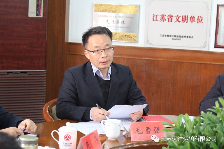 毛總首先向與會人員介紹了江蘇遠洋領導班子的調整情況,并傳達了省港口集團王永安董事長在江蘇遠洋領導班子調整會議上的講話精神,并對江蘇遠洋新世紀2018年度工作提出了五點要求,一是要對江蘇遠洋物流板塊的整合充滿信心,把新的發(fā)展機遇,轉化為內生動力,努力做大做強物流板塊。二是要增強政治意識、大局意識、廉潔意識、風險意識。三是要充分發(fā)揮好我們的整體優(yōu)勢,依托集團平臺,充分利用好資源,不斷提升我們的攬貨能力和市場份額。四是要加強制度建設,完善績效考核,充分調動大家的積極性。五是要切實加強人才隊伍建設,為創(chuàng)建一流的遠洋物流提供人才支持和智力保障。