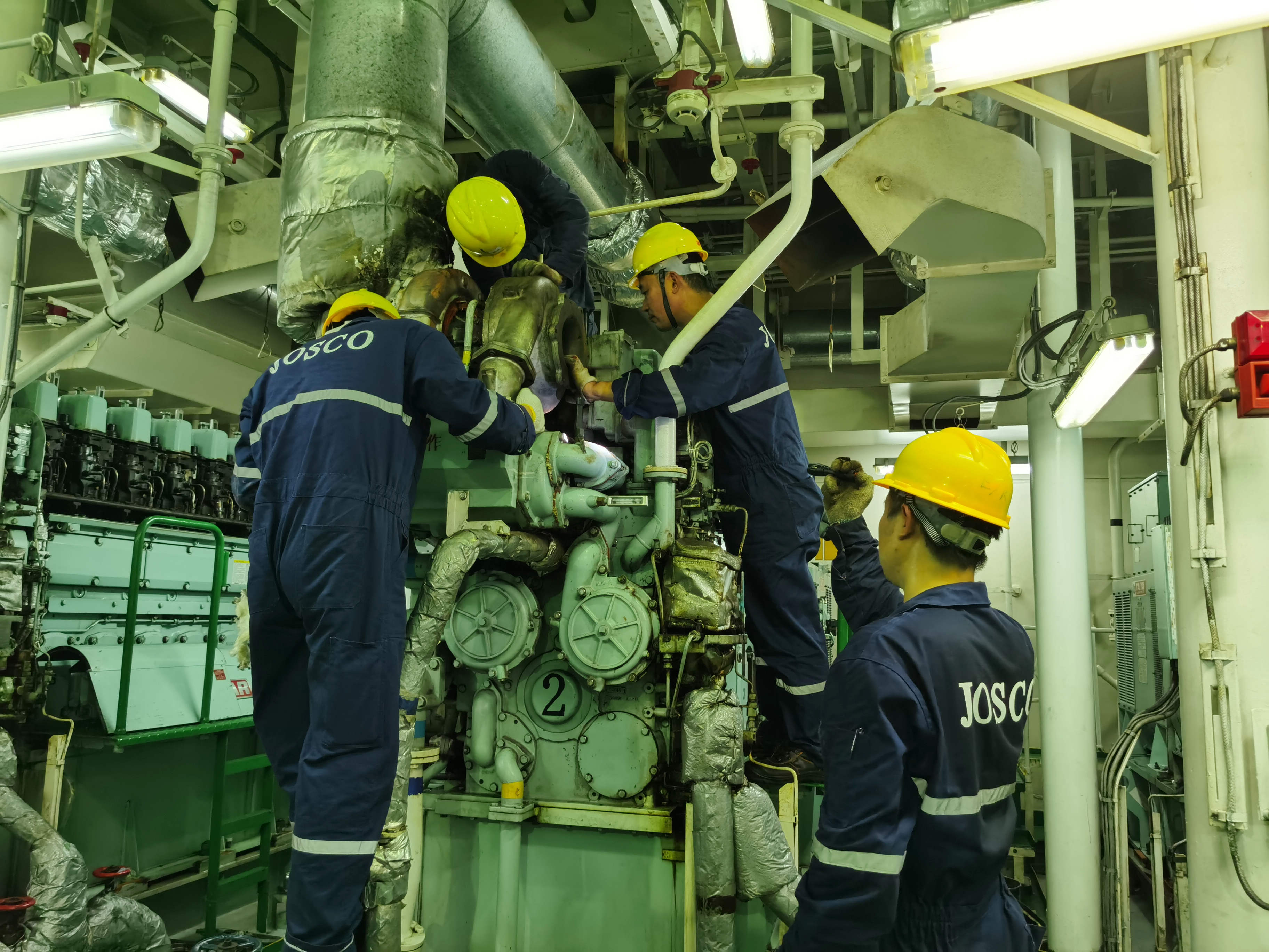此時(shí)已是深夜,江蘇遠(yuǎn)洋岸基團(tuán)隊(duì)同樣熬著夜、懸著心。經(jīng)過船上和岸基管理團(tuán)隊(duì)共同研究,為確保萬無一失,決定同時(shí)進(jìn)行兩套搶修方案。方案一,焊接、修理損壞的舊水套,再安裝并進(jìn)行封缸運(yùn)行;方案二,用砂紙打磨新水套內(nèi)圈、調(diào)整尺寸,再安裝、進(jìn)行封缸運(yùn)行。在輪機(jī)長(zhǎng)陸蘭峰、大管輪孟濤帶領(lǐng)下,機(jī)艙全體人員默契配合,徹夜未眠、連續(xù)奮戰(zhàn),每個(gè)人的眼睛里都因焦急、熬夜而布滿血絲。一場(chǎng)困難重重的“終極賽跑”終于在船上時(shí)間11月20日迎來勝利的曙光。舊水套經(jīng)過焊接修理后,被成功安裝。此時(shí),所有人都舒了一口氣,船暫時(shí)安全了。但出于對(duì)船航行安全的長(zhǎng)遠(yuǎn)考慮,大管輪孟濤建議將舊水套拆除,換上打磨好的新水套。奮戰(zhàn)一夜,大家都已經(jīng)疲倦異常。但考慮到用舊水套封缸運(yùn)行也存在很大風(fēng)險(xiǎn),還要抵抗后續(xù)海上的惡劣天氣。于是,大家果斷決定,采納孟濤的建議,拆掉舊水套、重新安裝新水套。有了前面的安裝經(jīng)驗(yàn),在經(jīng)過多次調(diào)試調(diào)整后,新水套被成功裝到了5號(hào)發(fā)動(dòng)機(jī)缸頭上。那一瞬間,鋪天蓋地的喜悅充滿了整個(gè)機(jī)艙,慶幸、感動(dòng)還有滿滿的激動(dòng)洋溢在21個(gè)兄弟之間。