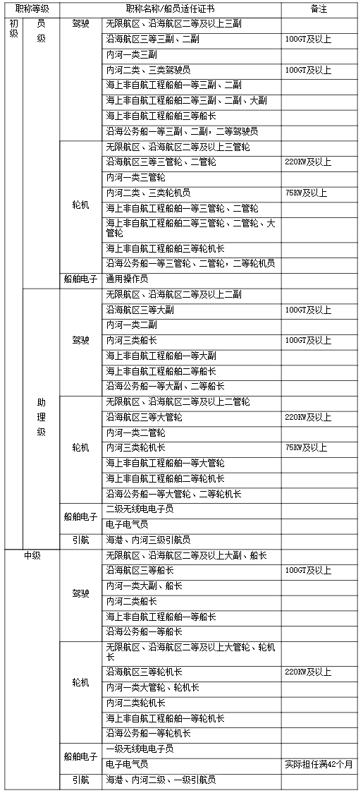 備注:本表由交通運(yùn)輸部根據(jù)船員(引航員)適任證書有關(guān)類別、等級(jí)、職務(wù)設(shè)置變化情況做相應(yīng)調(diào)整,經(jīng)人力資源社會(huì)保障部備案后發(fā)布。