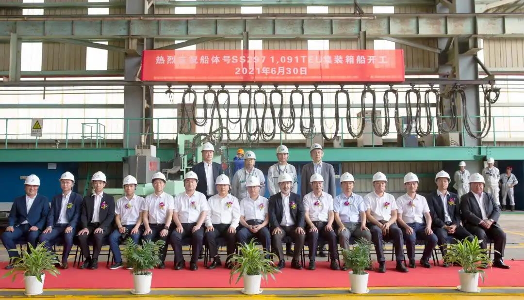 江蘇遠(yuǎn)洋所屬太倉海運(yùn)與常石舟山船廠簽訂3艘1091TEU集裝箱船(SS297/298/299)投資建造合同。6月30日上午,第一艘1091 TEU集裝箱船SS297在常石舟山船廠青山加工車間舉行了開工儀式。常石舟山造船總經(jīng)理佐藤二郎等廠方代表,NK船級社中國公司總裁東史彥等NK船級社代表,江蘇遠(yuǎn)洋黨委書記、董事長晁陽等船東代表,三方領(lǐng)導(dǎo)代表出席了開工儀式,共同見證這一重要時刻。