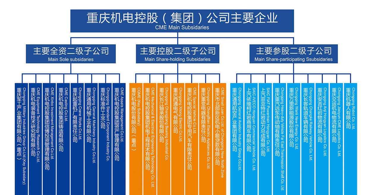 | Chongqing Machinery & Electronics Holding (Group) Co. Ltd. (CME) is a state-owned holding group corporation organized by Chongqing Municipal Government after the revocation of the previous Mechanical Industry Management Bureau, the Electronics Industry Management Bureau and the Metallurgical Industry Management Bureau in August, 2008. CME is an investment organization authorized by Chongqing State Owned Assets Supervision and Administration Commission to manage state owned assets. Chongqing Heavy Vehicle Group Co. Ltd. merged into CME in 2004. CME now directly manages 31 enterprises, 131 subsidiaries, holding an H-share listed company and sharing an A-share listed company. 1. CME Business Sector CME’s business ranges over fields of high-end equipment manufacturing, electronic information, transportation equipment, basic manufacturing & materials, and equipment manufacturing service industry, etc. The total assets of CME reached 63.48 billion Yuan in 2017, realized the business revenue of 57.87 billion Yuan, total profit of 2.55 billion Yuan. CME owns 2 national-level Technology Centers and 24 city-level Technology Centers; 1 China Famous Brand product and 41 Chongqing Famous Brand products; and 4 Famous Trademarks of China. CME has developed various series of products with excellent quality enjoying high reputation both at home and abroad, including Cummins high-powered engines, ABB large high-voltage transformers, refrigeration equipment, hydro-electric power generating equipment, nuclear power station equipment, CNC machine tools, heavy commercial vehicles, automotive transmission, high-grade precision and advanced national defensive electronic equipment, communication equipment, natural gas station & sewage treatment equipment complex, nonferrous metals smelting, and wires & cables, etc. 2. CME International Expansion Chongqing Machinery & Electrics Co. Ltd. (CQME) under CME listed in Hong Kong in 2008. In 2010, CME acquired 6 companies under Precision Technology Group UK (PTG) to build an overseas platform of innovation, marketing and investment. Since then, PTG has won the “Inward Investment Awards” of UKTI twice. In 2012, CME acquired the Enstrom Helicopter Corporation and launched a series of strategic development plan of emerging industries in Chongqing, including the general aviation manufacturing industry, general aviation business, and general aviation service, etc. In 2014, CME processed the military industry resource consolidation and established Chongqing Military Industries Group Co. Ltd. In the same year, CME set up a JV, Chongqing Robot Co. Ltd., and started to wade into the robotics industry. In 2017, CQME has finished the share acquisition and capital increase in an Italian power station design and construction company, called Water Gen Power (WGP). CQME has now been accounted for 49% of the total share of WGP and this successful acquisition has enabled CME to access to better resources and markets, which also realize the “European Technologies” into “Chinese Manufacturing”. 3. CME Brand and Vision CME has been ranking among the Top 500 Chinese Enterprises and Top 500 Chinese Manufacturing Enterprises for years, and has been awarded the prizes like “Outstanding Enterprise of Integrity in China” and “Honored Equipment Enterprise in China”, etc. CME is actively implementing the new “321” strategy (3 key areas: to pursue excellence in the existing industries, to develop new industries, and to keep on innovating; 1 vision: to realize Equipping China & Going Global). |