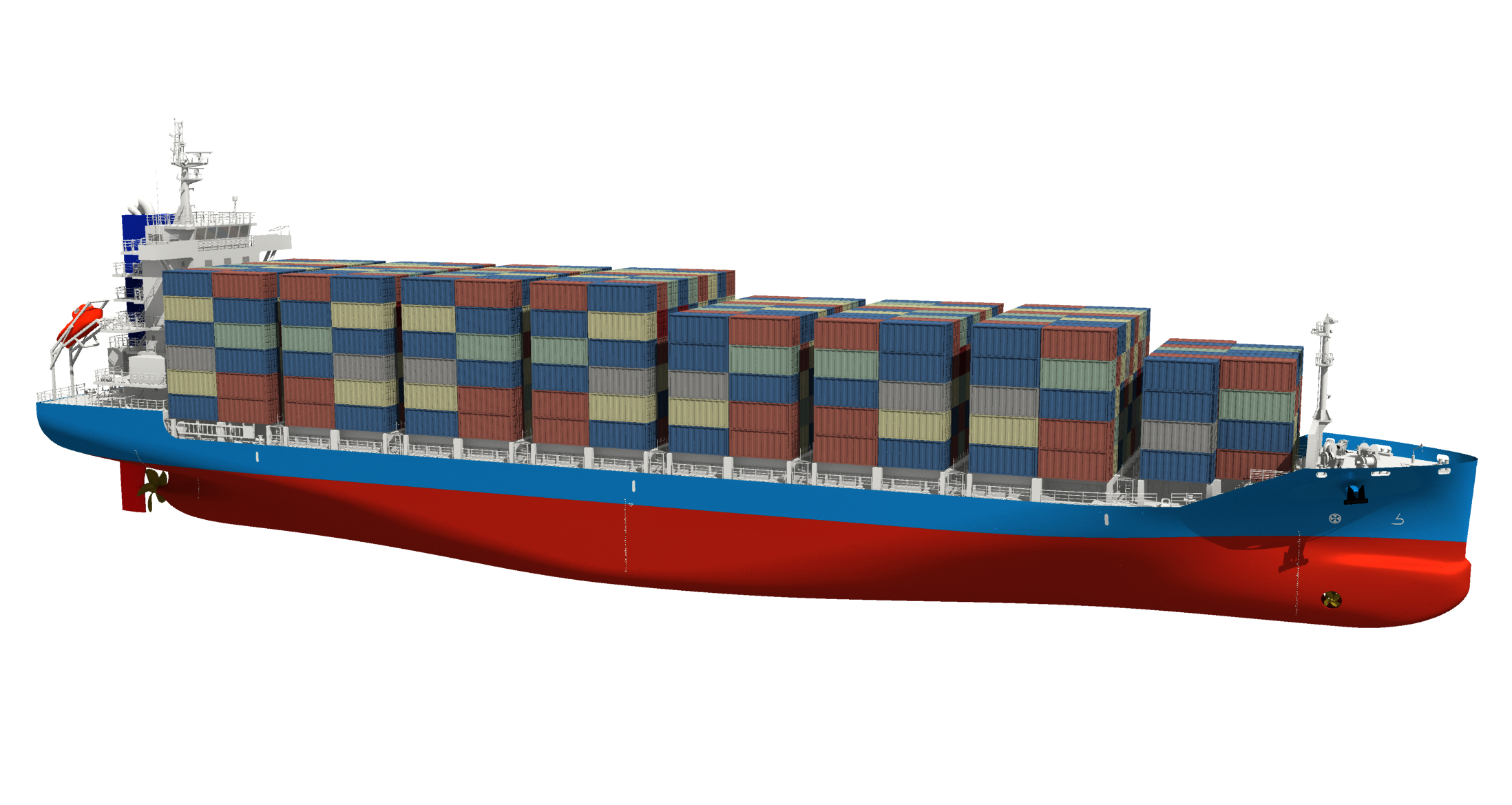 該類新型節(jié)能集裝箱船總長146米、型寬23.25米、型深11.5米,最大裝載量1091標(biāo)箱,吃水8.5米,總噸小于10,000GT。采用低阻船形設(shè)計,運(yùn)用常石集團(tuán)兩項(xiàng)獨(dú)家節(jié)能技術(shù)“TOP-GR”和“MT-FAST”。“TOP-GR”技術(shù)通過計算機(jī)精密計算與反復(fù)模擬試驗(yàn),對葉片數(shù)量、直徑、葉片截面形狀及幾何分布進(jìn)行最優(yōu)設(shè)計,研發(fā)出高效率低振動的節(jié)能型螺旋槳。“MT-FAST” 技術(shù)在螺旋槳前部安裝多個翼狀節(jié)能裝置,通過調(diào)整水流將推進(jìn)效率提高約4%。兩項(xiàng)技術(shù)的運(yùn)用,能有效提升燃效性能,在低燃料消耗技術(shù)方面符合船舶能效設(shè)計指數(shù)EEDI Phase 2標(biāo)準(zhǔn)。同時,新造船在提高甲板上裝卸集裝箱的作業(yè)效率及安全性方面,嚴(yán)格落實(shí)國際海事組織(IMO)規(guī)定的貨物積載和系固安全操作規(guī)則要求。