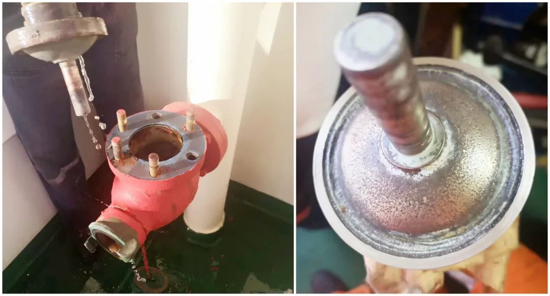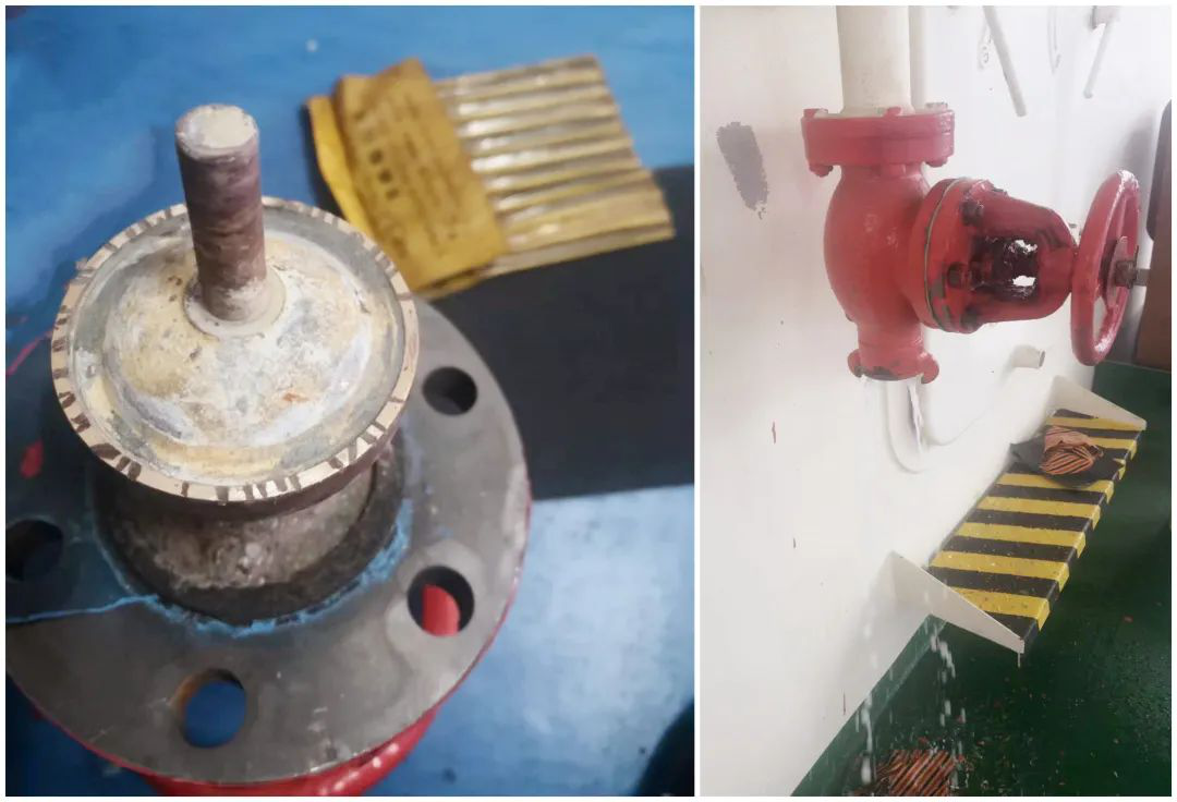 在“江遠廣州”輪上,好幾個消防栓漏水,三副懷疑消防栓的閥芯結了垢,打算拆開消防栓,給閥芯清潔清潔。他想象中的可能情況是閥芯的兩個接觸面上生了海蠣子或者附著了什么堅硬的東西,導致閥芯關不嚴漏水。只要清除掉這些臟東西,消防栓就能完好如初。