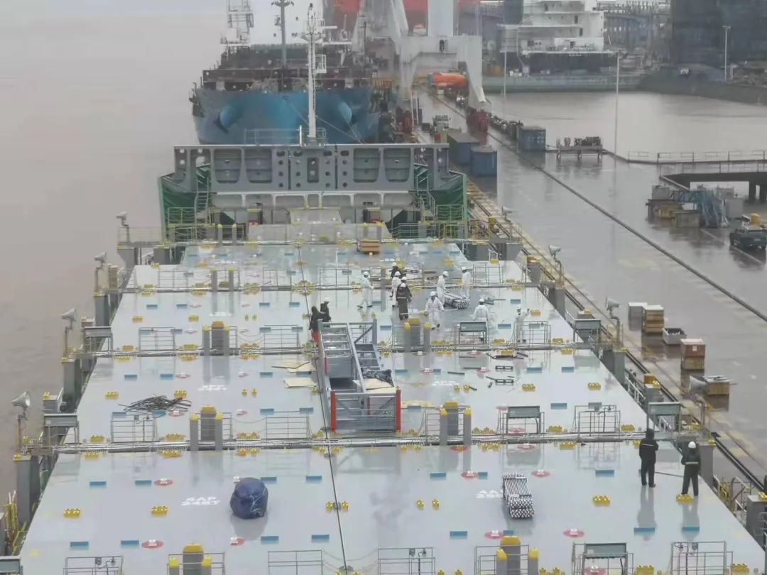 受12號臺風(fēng)“梅花”前沿影響,舟山附近陣雨不斷,兄弟們穿上雨衣,全船兄弟齊心協(xié)力,冒著雨一起接收綁扎件,中午到船廠食堂簡單地吃完午飯又回到船上。這時,監(jiān)造組找我們接船船員商量,由于12號臺風(fēng)“梅花”預(yù)計14日晚上或15日凌晨在舟山附近登陸,影響到交接新船,原計劃我們接船船員14日上船住船,可是13日下午船廠要撤舷梯和落大吊,14日無法上下船,監(jiān)造組征詢我們的意見后,和廠方商量,最后決定我們接船船員13日早上就上船住船,和部分廠方人員一起住船抗臺。定下計劃后,全體船員繼續(xù)搬綁扎件,終于在下午船廠下班前把所有綁扎件收上船并放到位,回去的車上,兄弟們沒有說累,都是在說終于完成了幾樣大事。