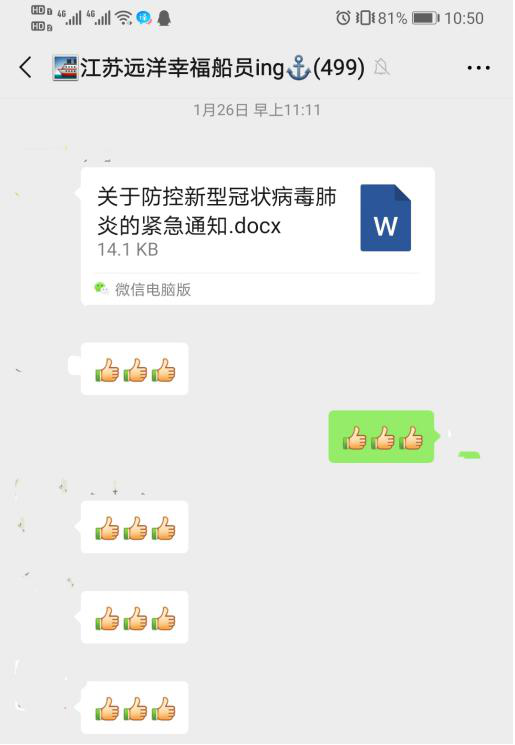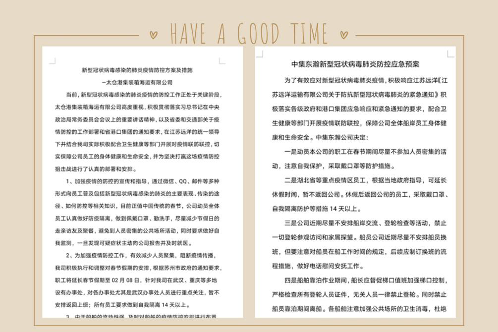 太倉海運(yùn)、中集東瀚、船員公司在公司的統(tǒng)一部署下,結(jié)合各公司業(yè)務(wù)情況及當(dāng)?shù)匾咔?,及時(shí)通過微信群、郵件等方式下發(fā)《太倉港集裝箱海運(yùn)有限公司新型冠狀病毒感染的肺炎疫情防控方案及措施》《中集東瀚新型冠狀病毒肺炎防控應(yīng)急預(yù)案》《船員公司加強(qiáng)預(yù)防新型冠狀病毒肺炎感染的通電》,確保公司黨委對(duì)防控工作要求傳達(dá)到每名船岸職工。