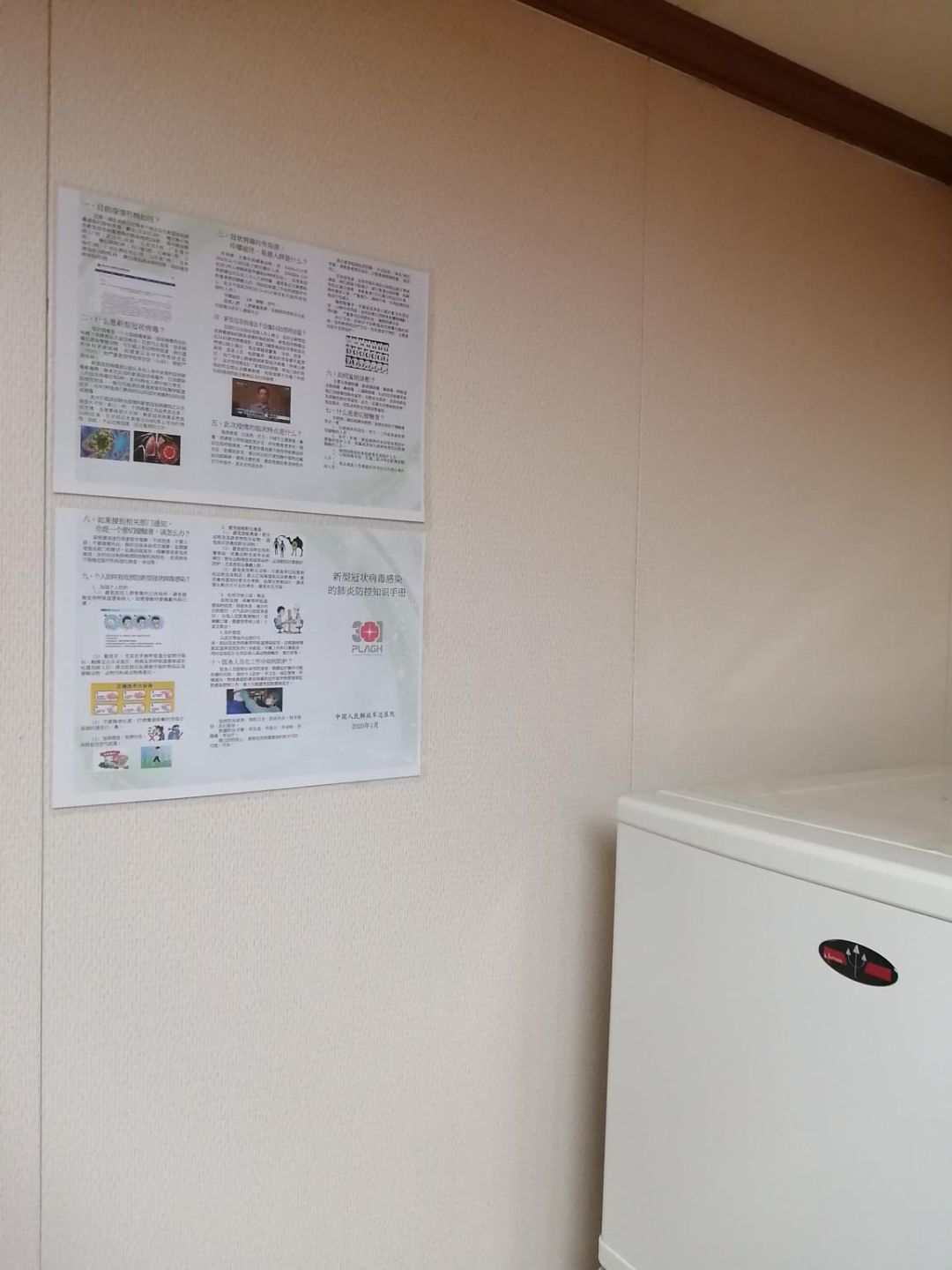 2月16日19:20,我輪順利靠妥碼頭。檢疫官員第一時(shí)間對(duì)所有船員進(jìn)行了體溫測(cè)試,并對(duì)公共場(chǎng)所、廚房、食品庫、病房以及部分船員房間進(jìn)行了檢查。