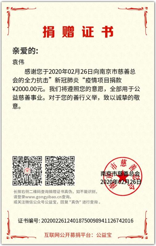 袁偉時刻關注著武漢的疫情防控一線信息,在防疫阻擊戰(zhàn)最艱巨的時刻,看到中國軍人、醫(yī)護人員逆行援鄂,他夜不能寐、深受鼓舞,毫不猶豫,自發(fā)向南京慈善總會捐助了2000元。“疫情無情人有情,只要我們精誠團結,就一定能勝利!”袁偉說:“我是一名共青團員,更是入黨積極分子,只要國家需要、公司需要,我時刻準備著。”