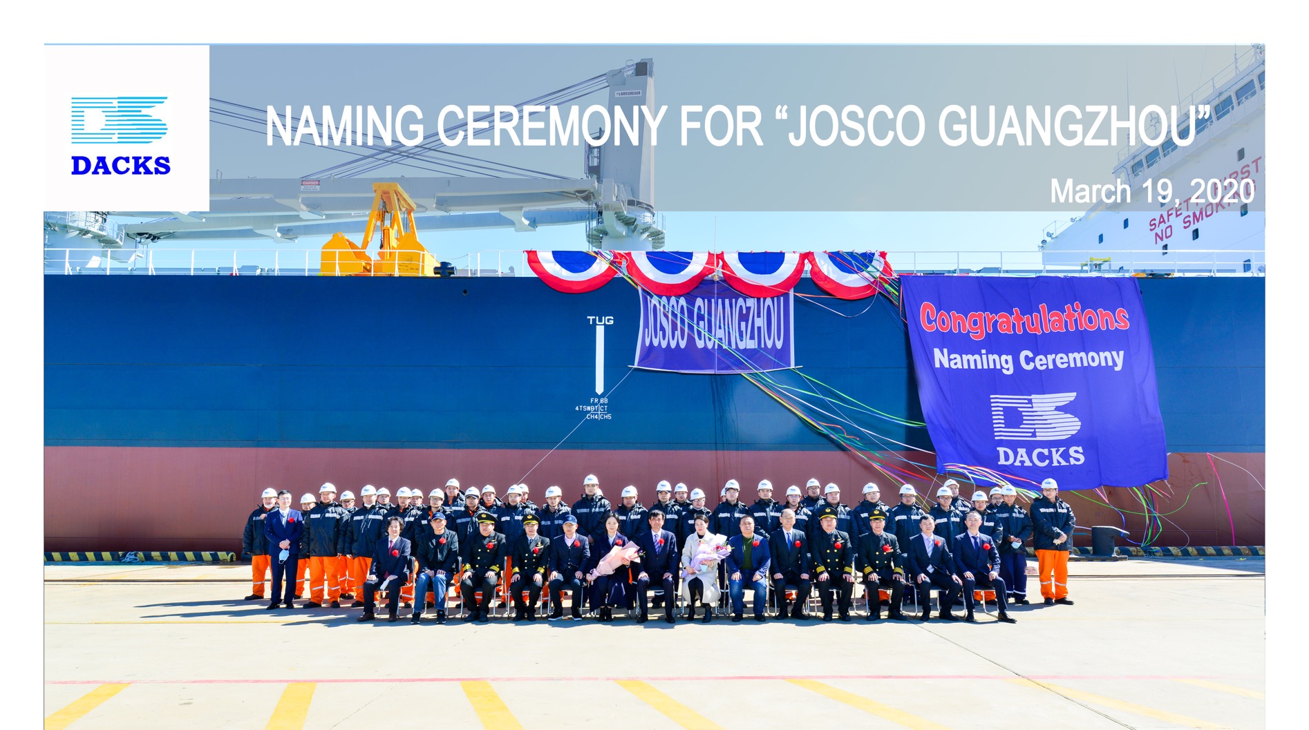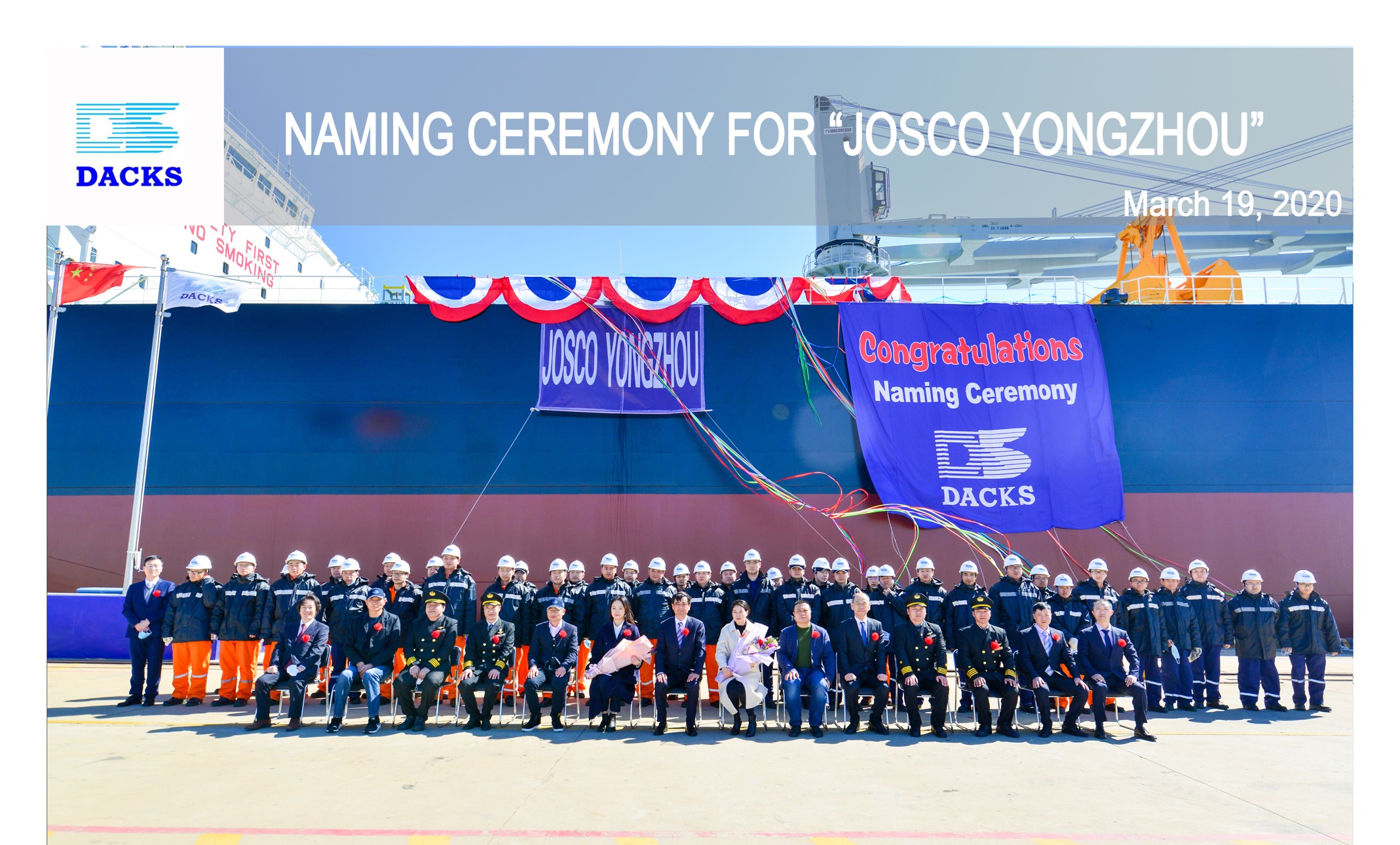 三月的大連,潮平岸闊,春意盎然。3月19日上午,在江蘇遠(yuǎn)洋駐廠監(jiān)造師、NK驗(yàn)船師和“江遠(yuǎn)永州”“江遠(yuǎn)廣州”輪船員等的共同見證下,一場特別的命名交船儀式在大連中遠(yuǎn)海運(yùn)川崎舾裝碼頭舉行。儀式簡潔莊重,現(xiàn)場吉祥熱烈。