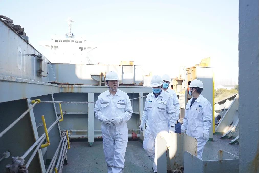 2月21日,公司黨委書記、董事長(zhǎng)晁陽(yáng),副總經(jīng)理黃明軒、紀(jì)委書記丁邦林一行來(lái)到五峰山船廠,登上靠泊塢修的“江遠(yuǎn)遠(yuǎn)星”輪調(diào)研檢查船舶疫情防控和安全生產(chǎn)情況,代表公司黨委慰問(wèn)奮戰(zhàn)在船舶一線的船員職工。