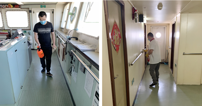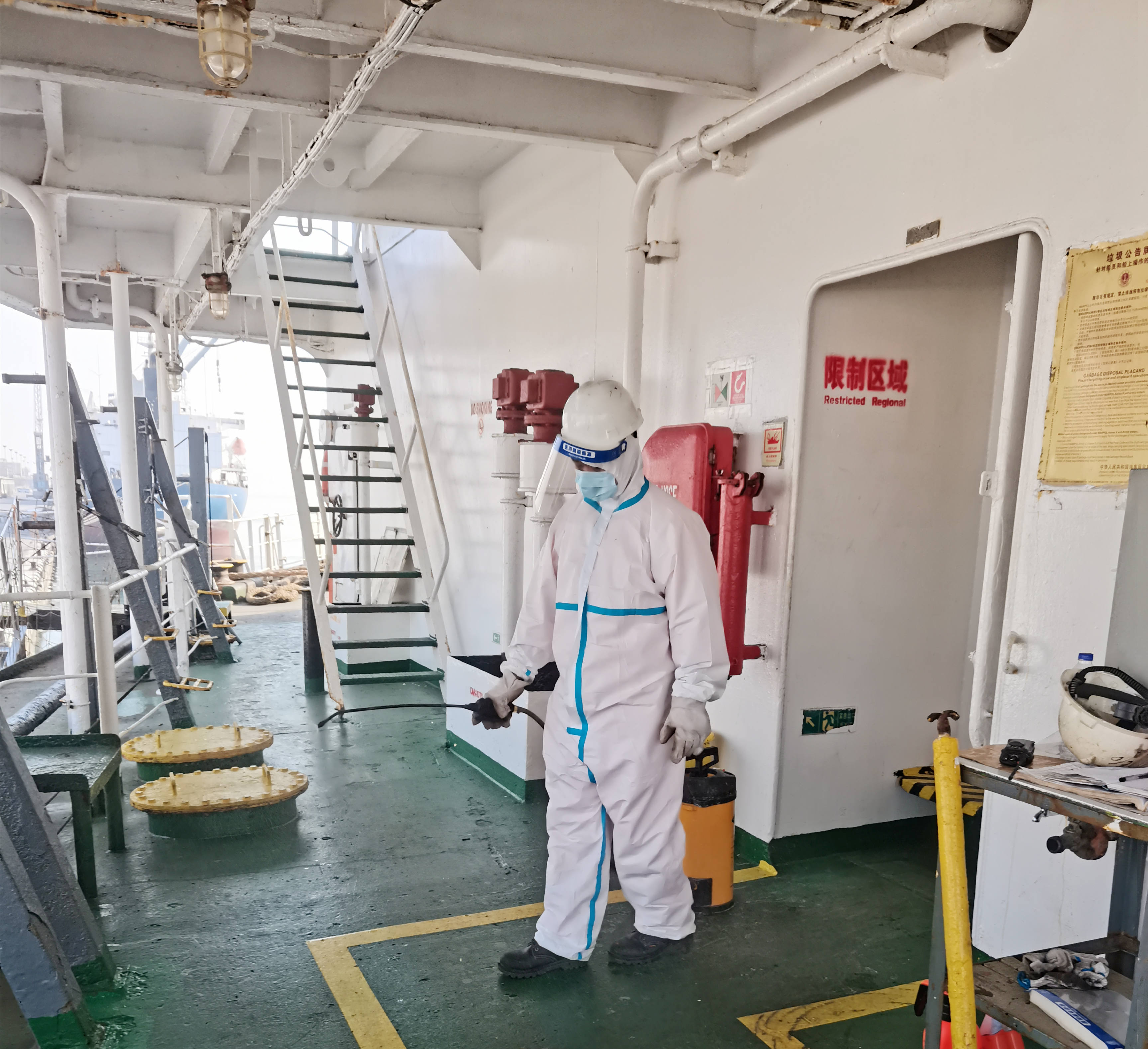 在關(guān)鍵細(xì)節(jié)上,大家更是容不得絲毫疏忽,如引航員、PSC官員等必須進(jìn)入船舶工作、生活區(qū)域的,一定要測量體溫,確保正常后在船員引導(dǎo)下方可沿規(guī)定路線進(jìn)入規(guī)定區(qū)域開展工作,并對其所經(jīng)過區(qū)域嚴(yán)格消殺,相關(guān)船員全程嚴(yán)密防護(hù)、保持安全距離。船員進(jìn)入克令吊操縱室內(nèi),也要做好防護(hù),并對操縱室每一個角落實施消殺,杜絕潛在的風(fēng)險。